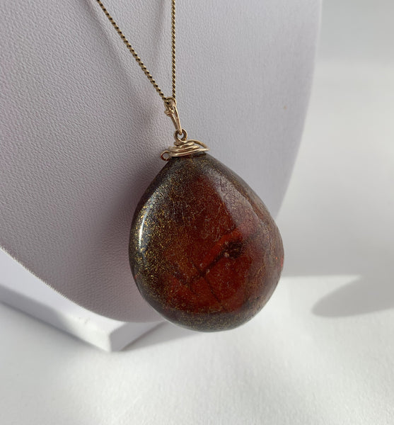 A 14-karat yellow gold amber pendant with insect inclusions and a 14-karat yellow gold fine curb link chain. A free-form drop-shaped natural amber pendant with a 14-karat yellow gold twisted suspension bale. The hue is brownish/red. The tone is medium dark.