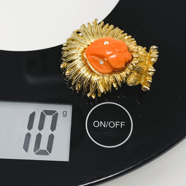 Lion Coral Color Lucite Head Gold Tone Brooch