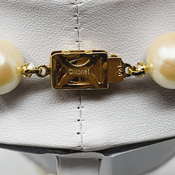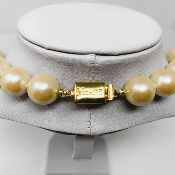 Monet, originally a monogram company founded in 1927, transitioned to costume jewelry in 1937 and became known for high-quality pieces. This necklace features cream-colored faux pearls and gold-tone oval settings, embodying the brand's classic and sophisticated aesthetic. Vintage Monet jewelry, particularly from the mid-20th century, is popular for its bold designs and durable plating. The necklace's design reflects the era's glamour, reminiscent of the 1960s, and is a testament to Monet's enduring appeal in the realm of costume jewelry.